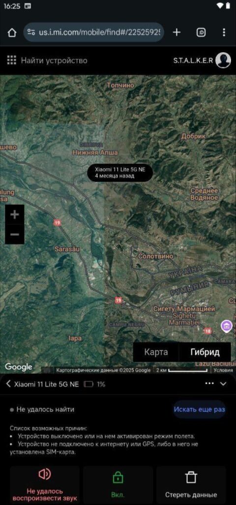 Телефон был помечен как потерянный в приложении для геолокации. По данным отслеживания, 13 января 2025 года устройство было вновь зафиксировано как активное — но уже на территории Украины, в посёлке Солотвино, рядом с пунктом пропуска «Солотвино–Сигет-Мармациеи».