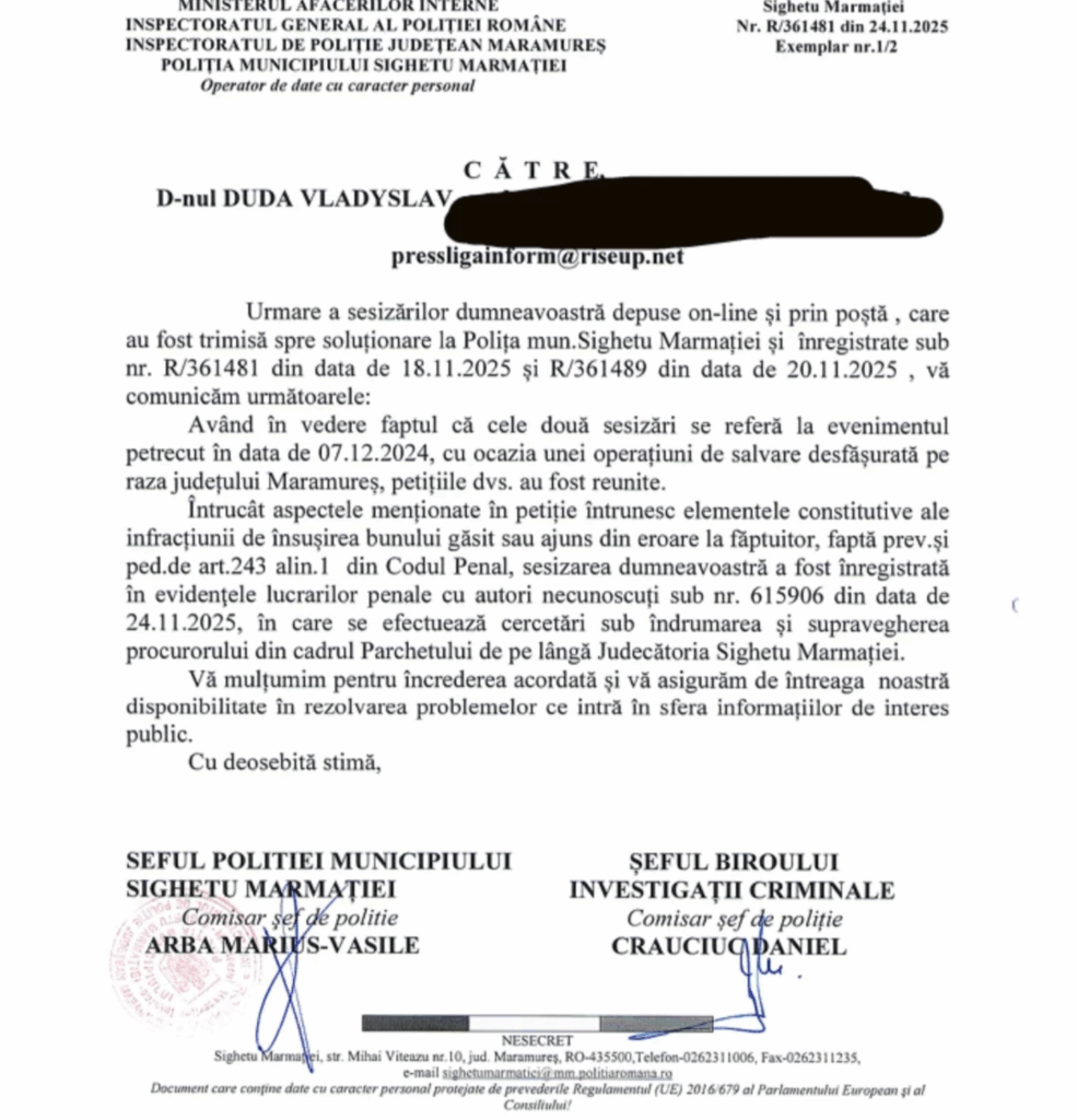 Владислав подал официальную жалобу в полицию Румынии с просьбой зарегистрировать факт утраты телефона и проверить его дальнейшее перемещение. Он сообщил, что имеет скриншоты геолокации устройства и готов передать их следствию. Параллельно материалы сохранены в резервных архивах — на случай утраты или попытки уничтожения доказательств.