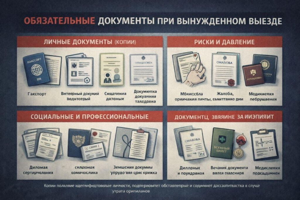 В проекте опубликована статья о подготовке ключевых документов, которые могут иметь значение при вынужденном выезде и пересечении границы, а также для последующих правовых процедур. В тексте описываются личные, медицинские, государственные и социально-профессиональные документы, которые важно собрать в копиях и привести в порядок заранее.1