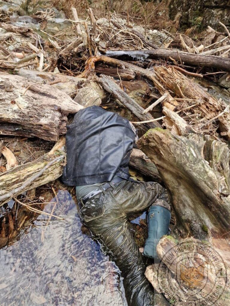 Место — горный поток, завалы деревьев, холодная вода, мокрые камни. Никаких троп, никакой инфраструктуры — только дикая, тяжёлая среда. Тело лежало среди брёвен и воды. Одежда промокшая, всё вокруг говорит о том, насколько суровыми могут быть такие условия для человека, оказавшегося здесь без поддержки и защиты.